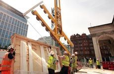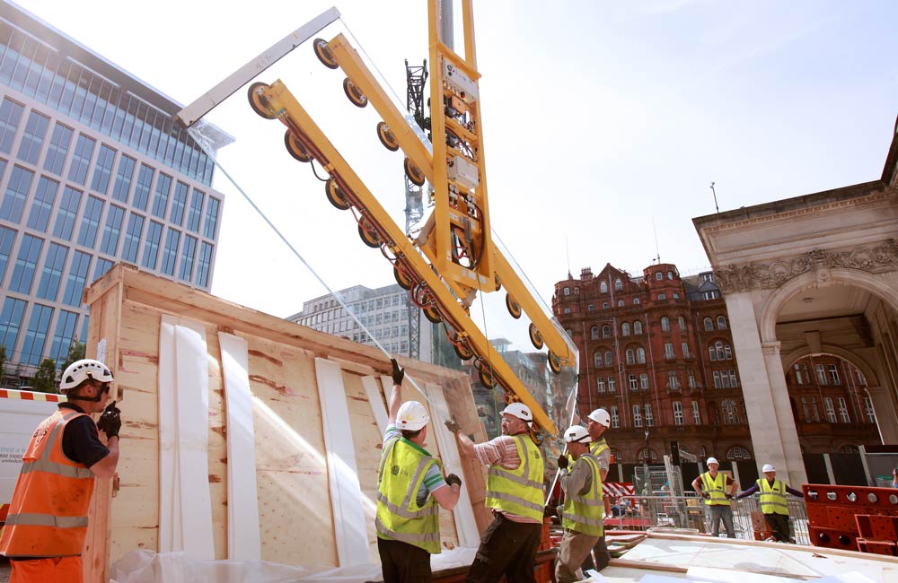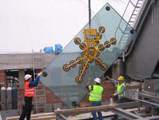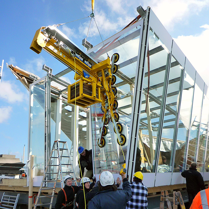 Für einen besonderen Bau in Manchester benötigt Firma Lindner ein besonders flaches Vakuumhebegerät, um die gebogenen Glaswände zu bewegen. Auch dieses Vakuumhebegerät dürfen wir entwickeln und fertigen.