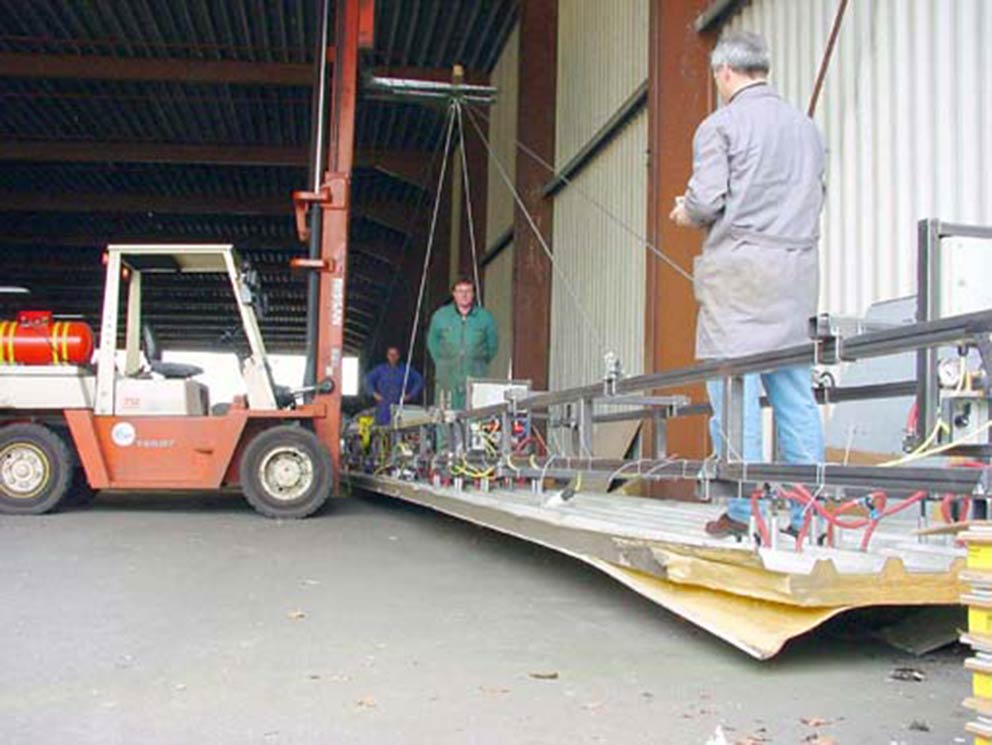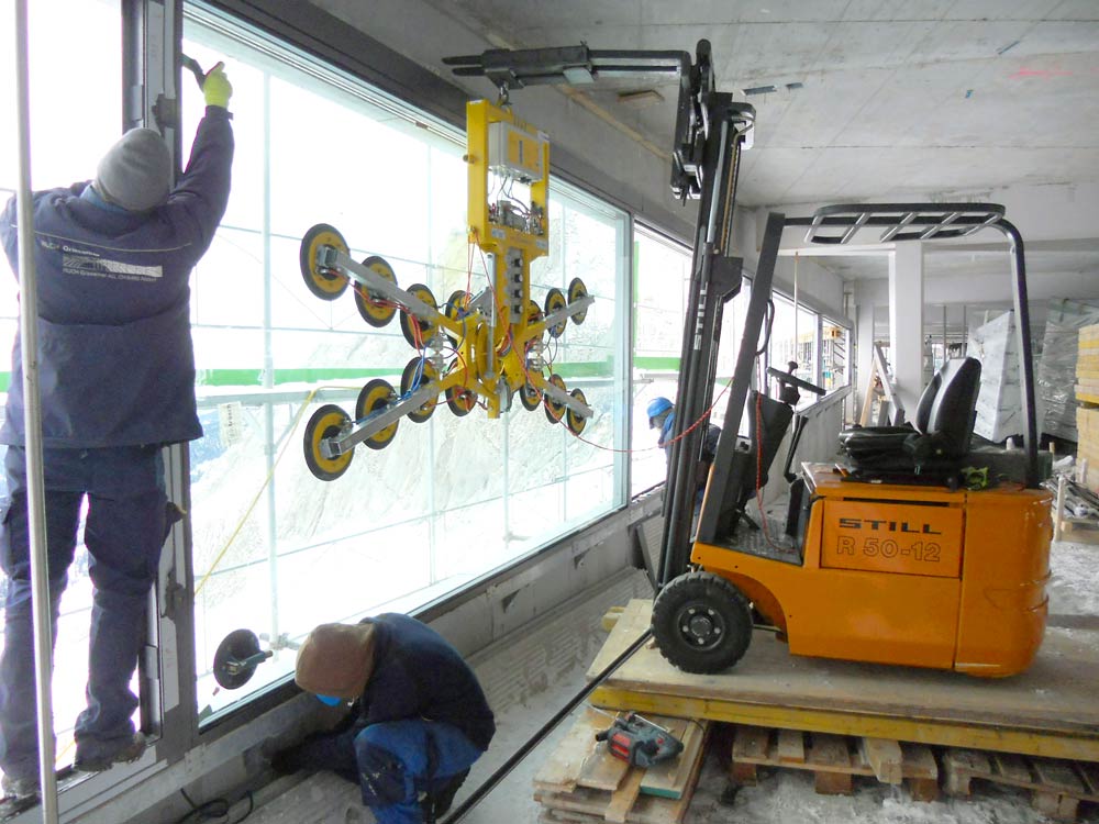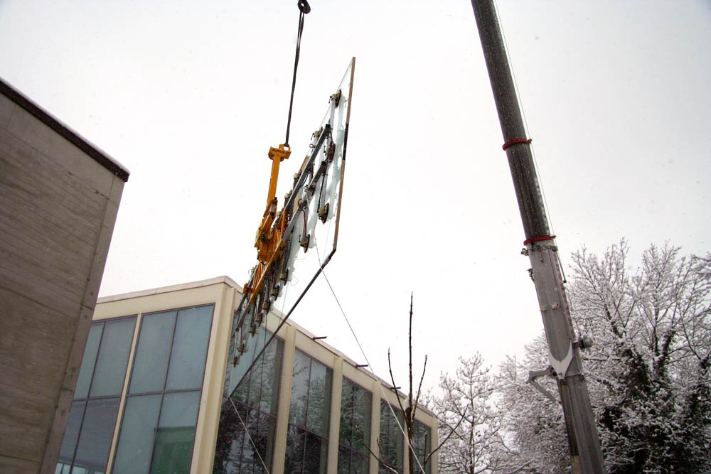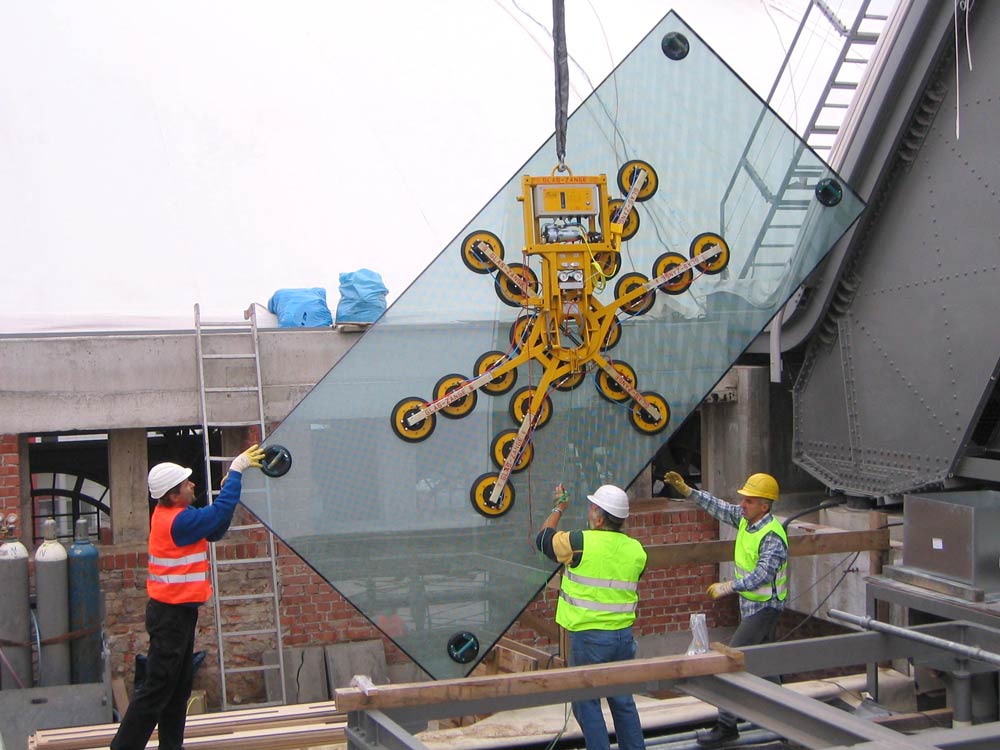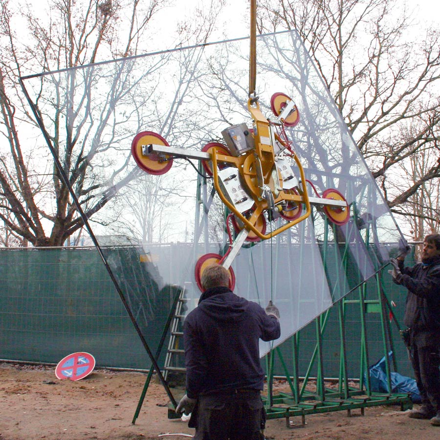 Für die Firma SGGS Döring aus Berlin fertigen wir ein Sonder-Vakuumhebegerät für 6 m in Längsrichtung gebogene Glasscheiben, mit dem sich konvex und konkav gebogene Glasscheiben bis zu einem Gewicht von 1400 kg problemlos schwenken lassen. Aus der Schweiz erhalten wir von der Firma Hevron einen Großauftrag für mehrere Vakuumhebegeräte, die bis zu 1700 kg bewegen können.